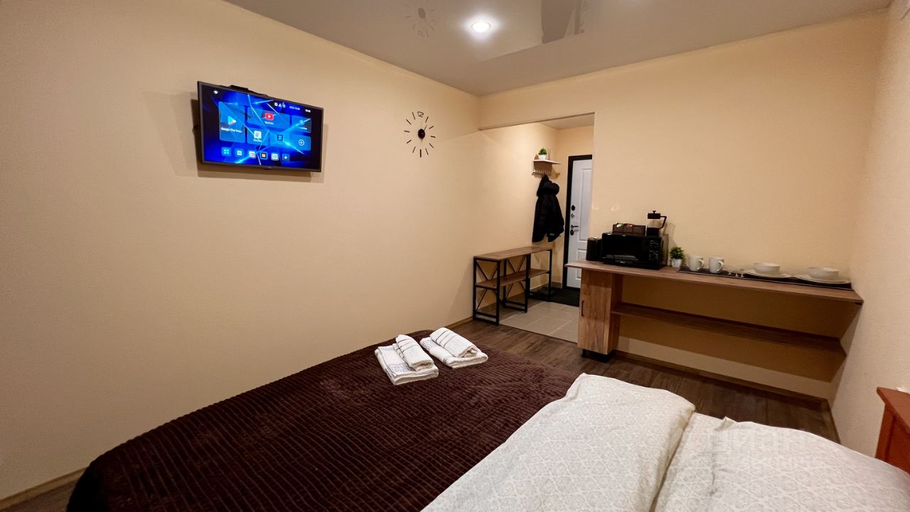 Студия небольшая, но тёплая и продуманная. Двуспальная кровать, Smart-TV, быстрый Wi-Fi, мини-кухня, всё под рукой. Санузел отдельный. Постельное бельё, полотенца, мыло, шампунь, гель, всё уже ждёт гостей. Заехали и живёте, ничего лишнего с собой не нужно. Заселение полностью бесконтактное, максимально удобно.