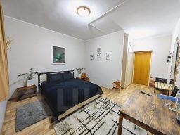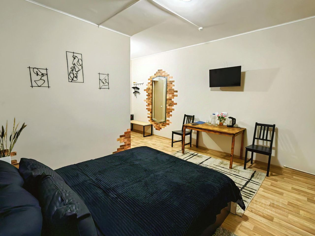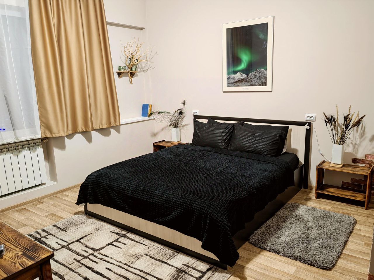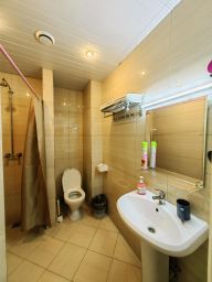 Двуспальная кровать 160х200, прикроватные тумбочки, телевизор, чайник, холодильник, туалет, душ, махровые халаты, фен, тапочки.