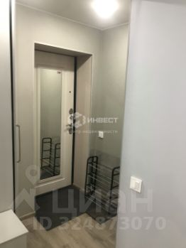 В коридоре угловой шкаф под потолок, входная дверь с зеркалом, обувница.