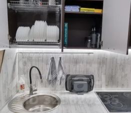 - Посудомоечная машина Bosch, стиральная машина, новый чайник с температурный режимом, микроволновка-гриль с кучей наворотов, новые фен, утюг, плита и вытяжка, большая плазма, Wi-Fi, даже йогуртница есть))