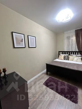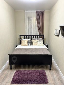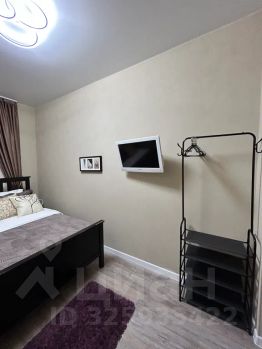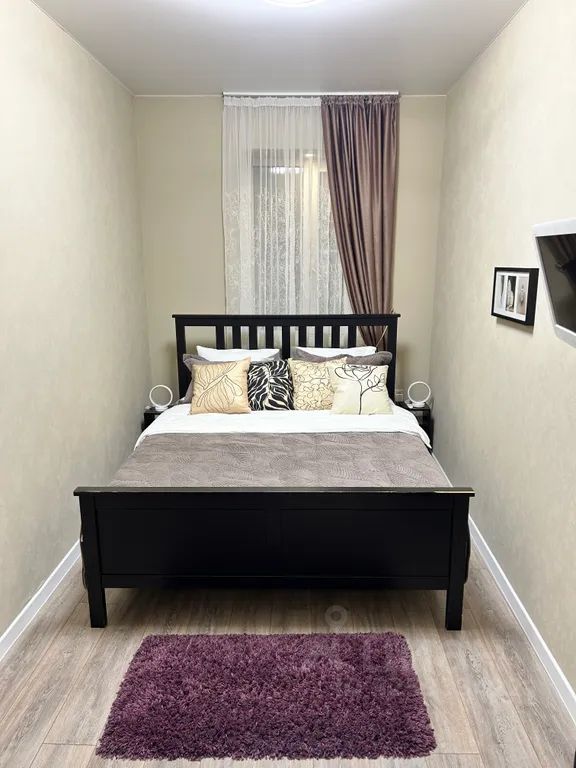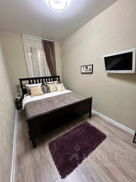 В квартире есть отдельная спальня с двуспальной кроватью, вместительным комодом, открытой компактной гардеробной системой и телевизором.