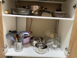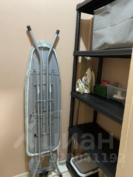 Отдельная гардеробная с системой хранения для вещей гостей и хозяйственных принадлежностей: гладильной доски, сушилки.