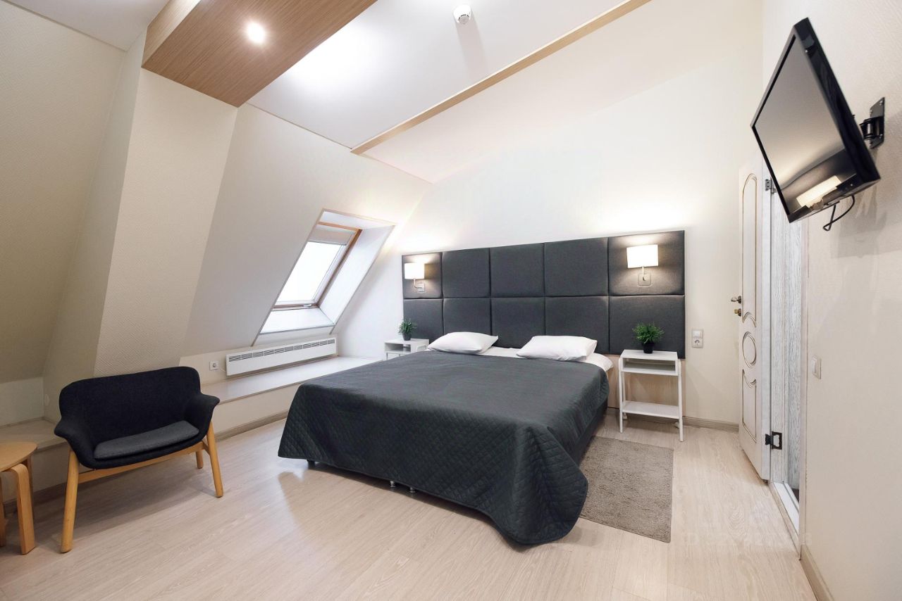 Однокомнатный номер с двуспальной кроватью. По запросу гостей кровать может быть заменена на 2 раздельные. По две прикроватные тумбочки, шкаф-купе, кресло, стол, ЖК - телевизор, бесплатный Wi-Fi, внутренний телефон, сейф, обогрев номера круглый год, душ.