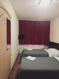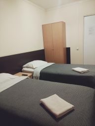 Уютный Двухместный номер, класса Эконом, для размещения двоих гостей. Душевая, туалет, раковина находятся возле номера, с расчетом на 2 номера. Прилагается полотенце 2 шт. и мыльные и туалетные принадлежности. Также в номере имеется все необходимое для комфортного проживания, односпальные кровати, постельное белье, прикроватная тумба, стул, телевизор, вешалка для одежды, зеркало, шкаф для размещения вещей, обогреватель. Окно, шторы блэкаут. На этаже имеется общая кухня, снащенная всем необходимым (Телевизор, зона для приема пищи, кулер, холодильник, варочная панель, мирковолновая печь, вся необходимая посуда), кофе аппарат, охладительные напитки, газировка. Возможность стирки, сушки и глажки белья. Свободная парковка возле отеля. Видео наблюдение. Круглосуточная стойка администрации. Отель расположен в спальном районе, в 2 км от центра города. В доме имеется круглосуточный магазин, в шаговой доступности рестораны, кафе, кинотеатр, сетевые магазины.