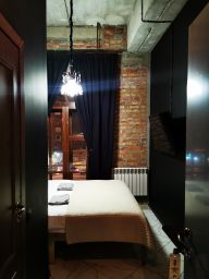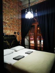 Оригинальный номер в стиле лофт с двуспальной кроватью. В номере большое окно, удобный матрас, кронштейн с вешалками для одежды, телевизор с плоским экраном и бесплатный Wi-Fi.
