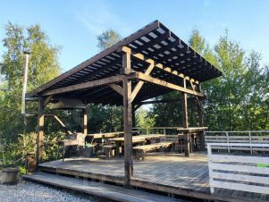 На участке большая беседка с мангалом, казаном и вместительным столом;