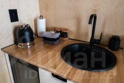 В кухне есть мини-холодильник, плита, чайник, микроволновая печь, смарт-ТВ, посуда и столовые приборы. В доме также есть санузел с душем, феном, теплыми полами, шторы блэкаут и WI-FI. В стоимость включены: чай/кофе, постельное белье, полотенце, туалетные принадлежности, тапочки, халаты и парковка. Курение на территории запрещено.