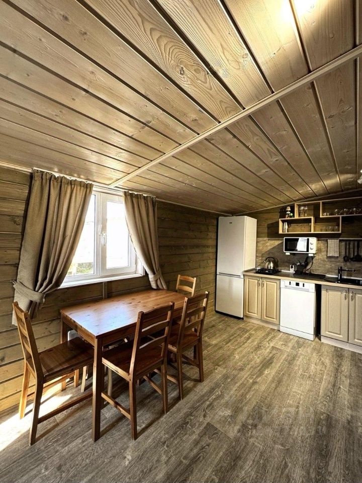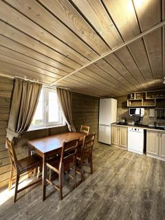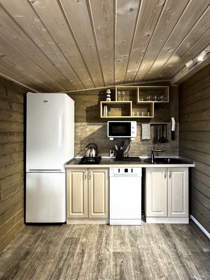Высота потолка от 2.2. до 2.4 м. Дом отапливается круглосуточно, гости заезжают в теплый дом. Есть все необходимое: посудомоечная машина, телевизор, фен, душ, туалет, горячая и холодная вода, кухонная зона с посудой, электроплита, холодильник, чайник, постельное белье и полотенца предоставляются.