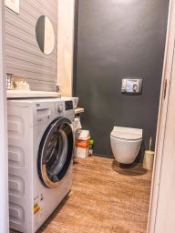 Кухня оборудована варочной панелью, микроволновой печью, посудомоечной машиной, кофеваркой, тостером, чайником и холодильником. Также есть полный комплект посуды и кухонных принадлежностей.