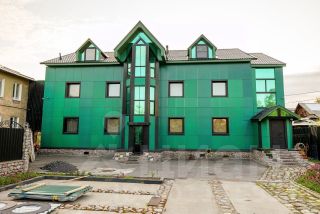 Дом кирпичный (ширина стен 60 см). Фундамент бетонно-монолитный углубленный. Наружная отделка дома выполнена композитными панелями и профнастилом. Междуэтажные перекрытия железобетонные. Двухскатная крыша из финской черепицы Ruukki. Везде установлены стеклопакеты ПВХ. Полы: плитка и ламинат.