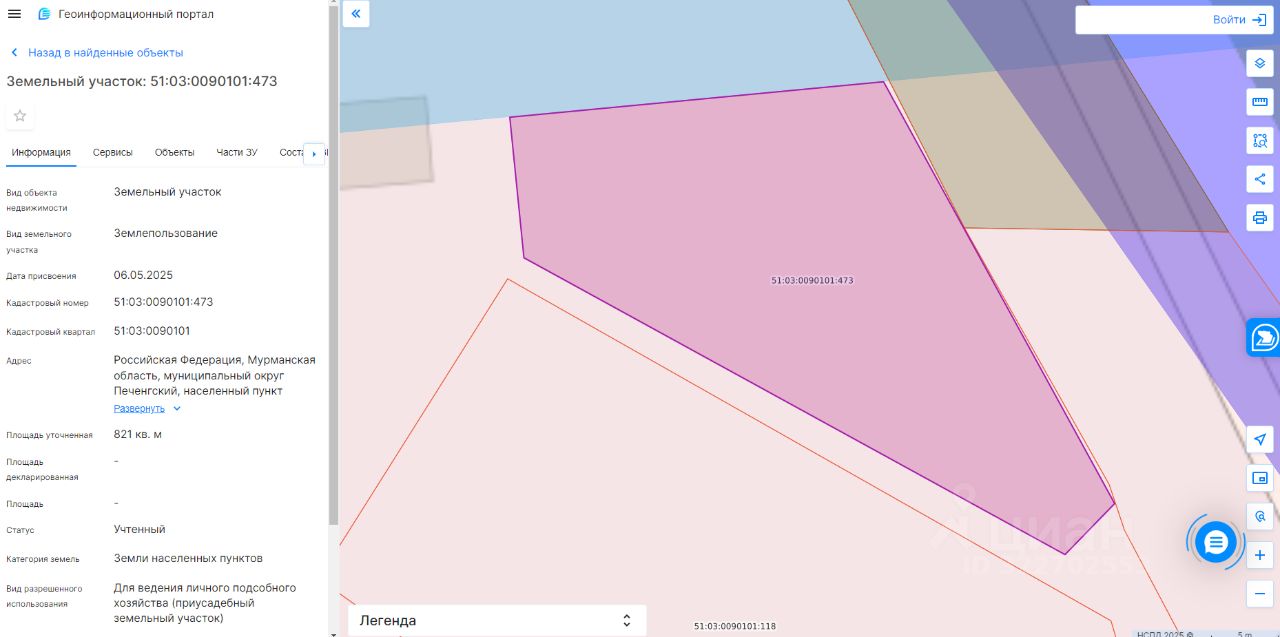 Земельный участок с кадастровым номером 51:03:0090101:473 площадь 821 по адресу Российская Федерация, Мурманская область, муниципальный округ Печенгский, населенный пункт Борисоглебский
