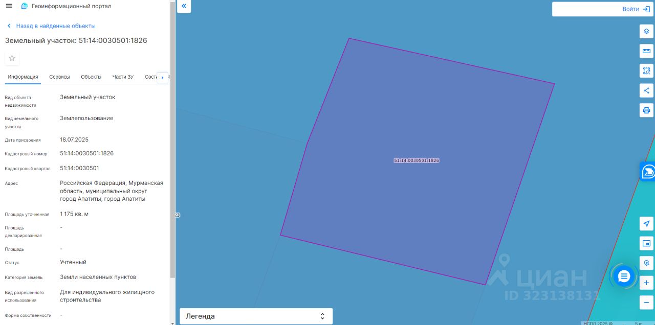 Земельный участок с кадастровым номером: 51:14:0030501:1826, площадь 1175, по адресу Российская Федерация, Мурманская область, муниципальный округ город Апатиты, город Апатиты