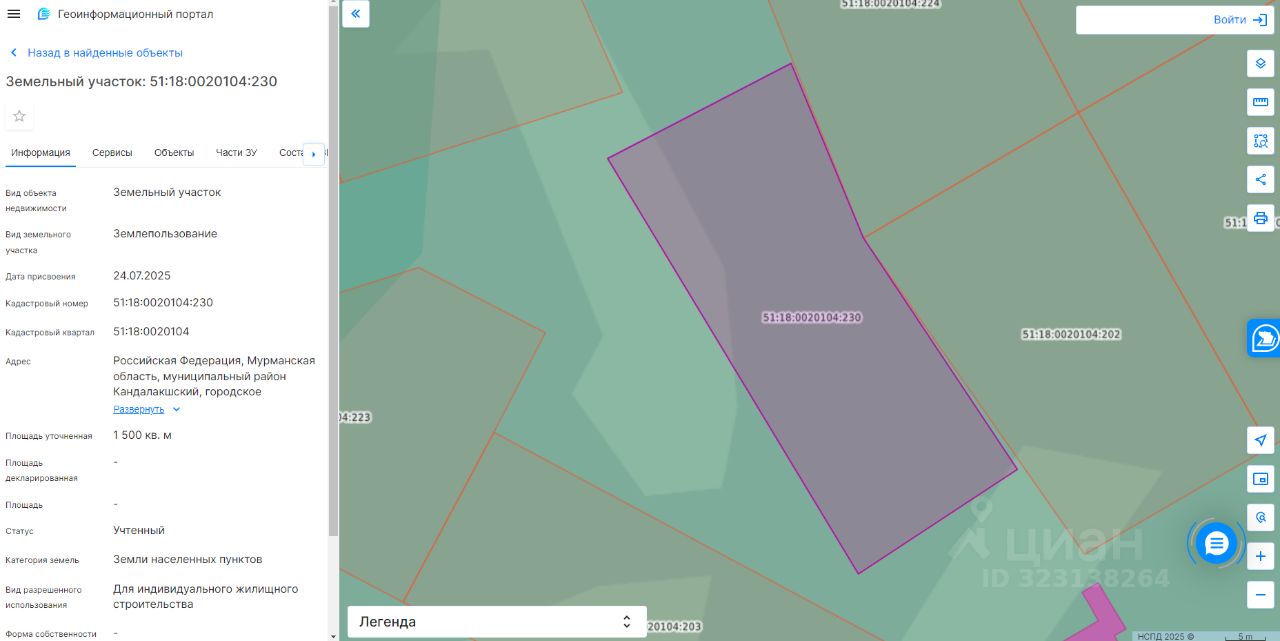 Земельный участок с кадастровым номером 51:18:0020104:230, площадь 1500, по адресу Российская Федерация, Мурманская область, муниципальный район Кандалакшский, городское поселение Кандалакша, город Кандалакша