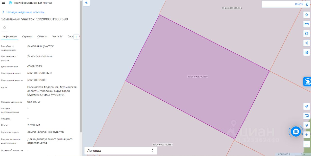 Земельный участок с кадастровым номером 51:20:0001300:598 площадь 964 по адресу Российская Федерация, Мурманская область, городской округ город Мурманск, город Мурманск