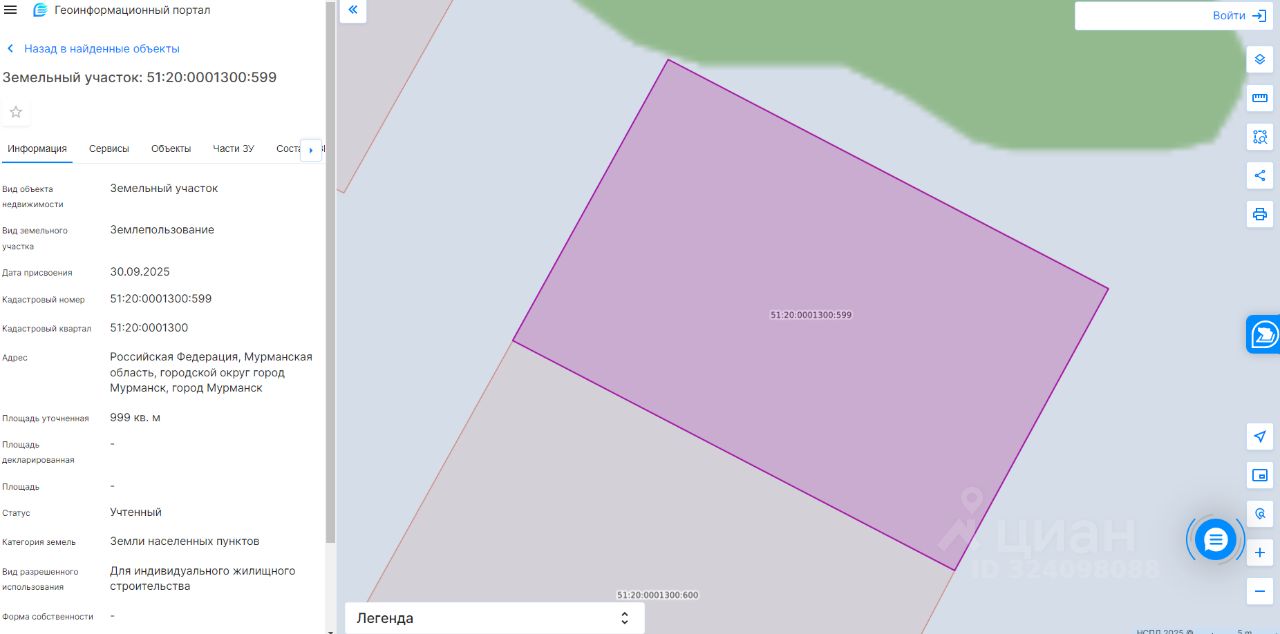 Земельный участок с кадастровым номером 51:20:0001300:599 площадь 999 по адресу Российская Федерация, Мурманская область, городской округ город Мурманск, город Мурманск