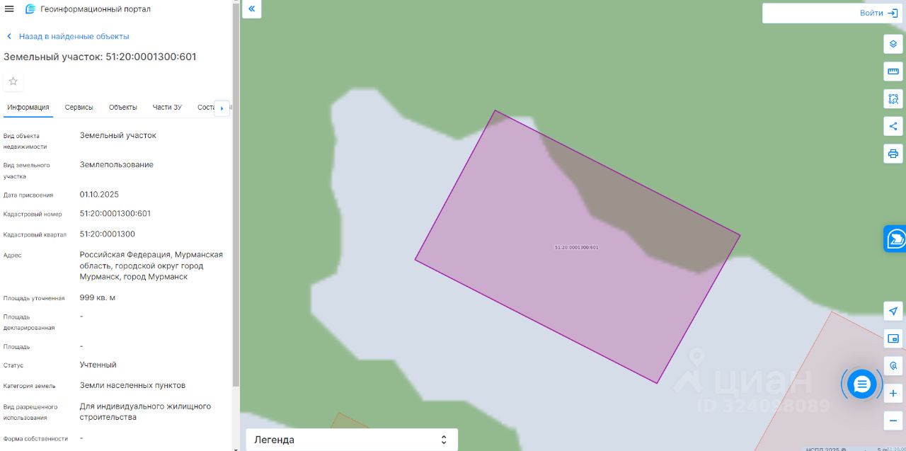 Земельный участок с кадастровым номером 51:20:0001300:601 площадь 999 по адресу Российская Федерация, Мурманская область, городской округ город Мурманск, город Мурманск