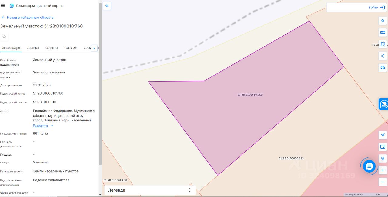 Земельный участок с кадастровым номером 51:28:0100010:760 площадь 961 по адресу Российская Федерация, Мурманская область, муниципальный округ город Полярные Зори, населенный пункт Зашеек