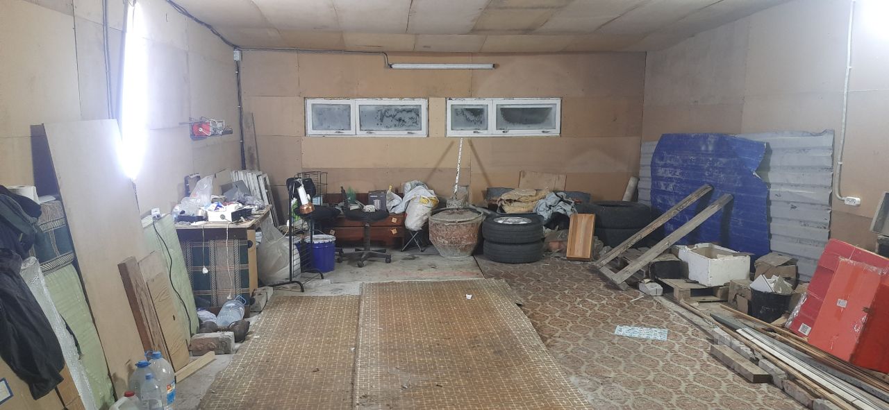 Просторный кирпичный гараж с бетонным полом, обшитый панелями мдф.