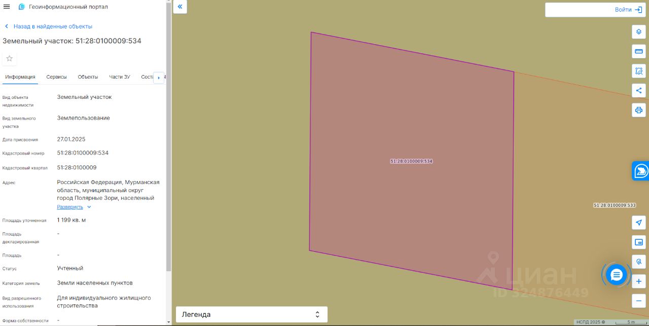 Земельный участок с кадастровым номером 51:28:0100009:534 площадь 1199 по адресу Российская Федерация, Мурманская область, муниципальный округ город Полярные Зори, населенный пункт Зашеек