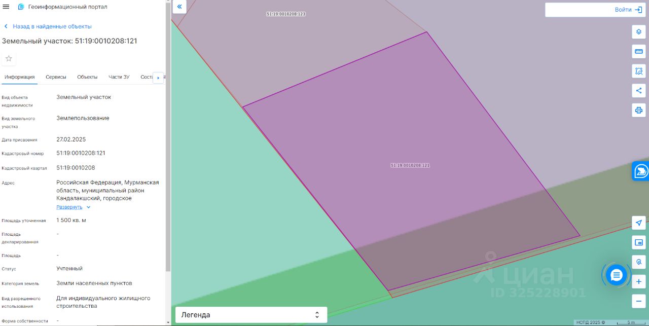 Земельный участок с кадастровым номером 51:19:0010208:121 площадь 1500 по адресу Российская Федерация, Мурманская область, муниципальный район Кандалакшский, городское поселение Кандалакша, село Лувеньга