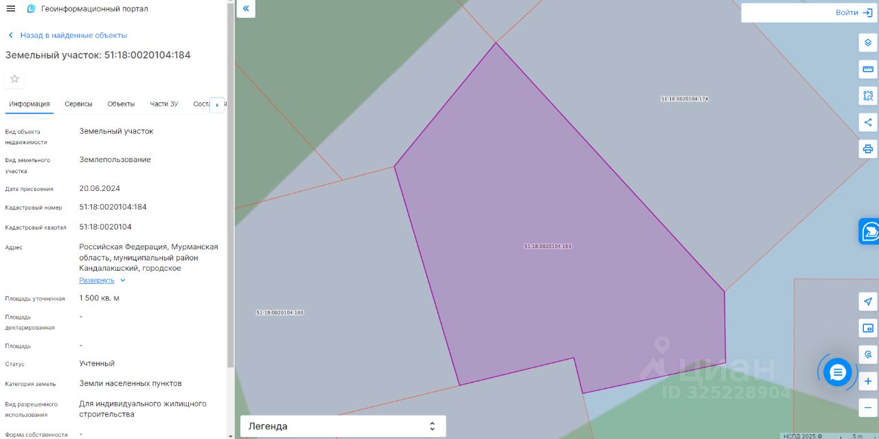 Земельный участок с кадастровым номером 51:18:0020104:184 площадь 1500 по адресу Российская Федерация, Мурманская область, муниципальный район Кандалакшский, городское поселение Кандалакша, город Кандалакша