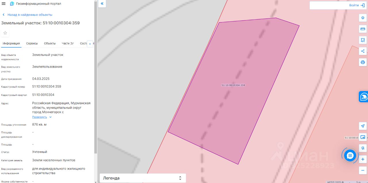 Земельный участок с кадастровым номером 51:10:0010304:359 площадь 876 по адресу Российская Федерация, Мурманская область, муниципальный округ город Мончегорск с подведомственной территорией, город Мончегорск, улица Привокзальная