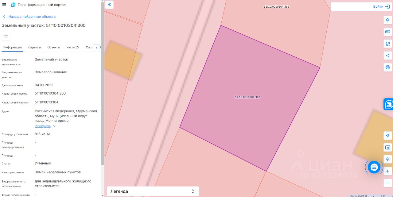 Земельный участок с кадастровым номером 51:10:0010304:360 площадь 816 по адресу Российская Федерация, Мурманская область, муниципальный округ город Мончегорск с подведомственной территорией, город Мончегорск, улица Полевая