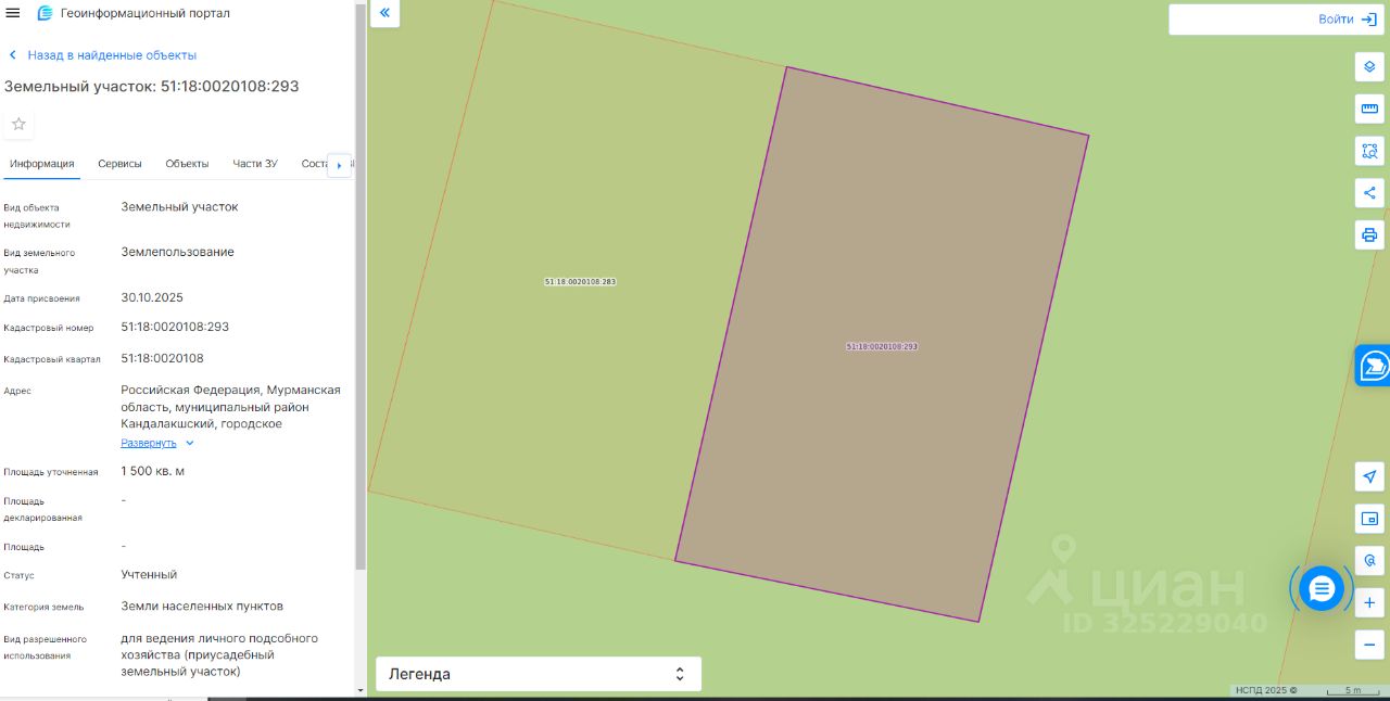 Земельный участок с кадастровым номером 51:18:0020108:293 площадь 1500 по адресу Российская Федерация, Мурманская область, муниципальный район Кандалакшский, городское поселение Кандалакша, город Кандалакша