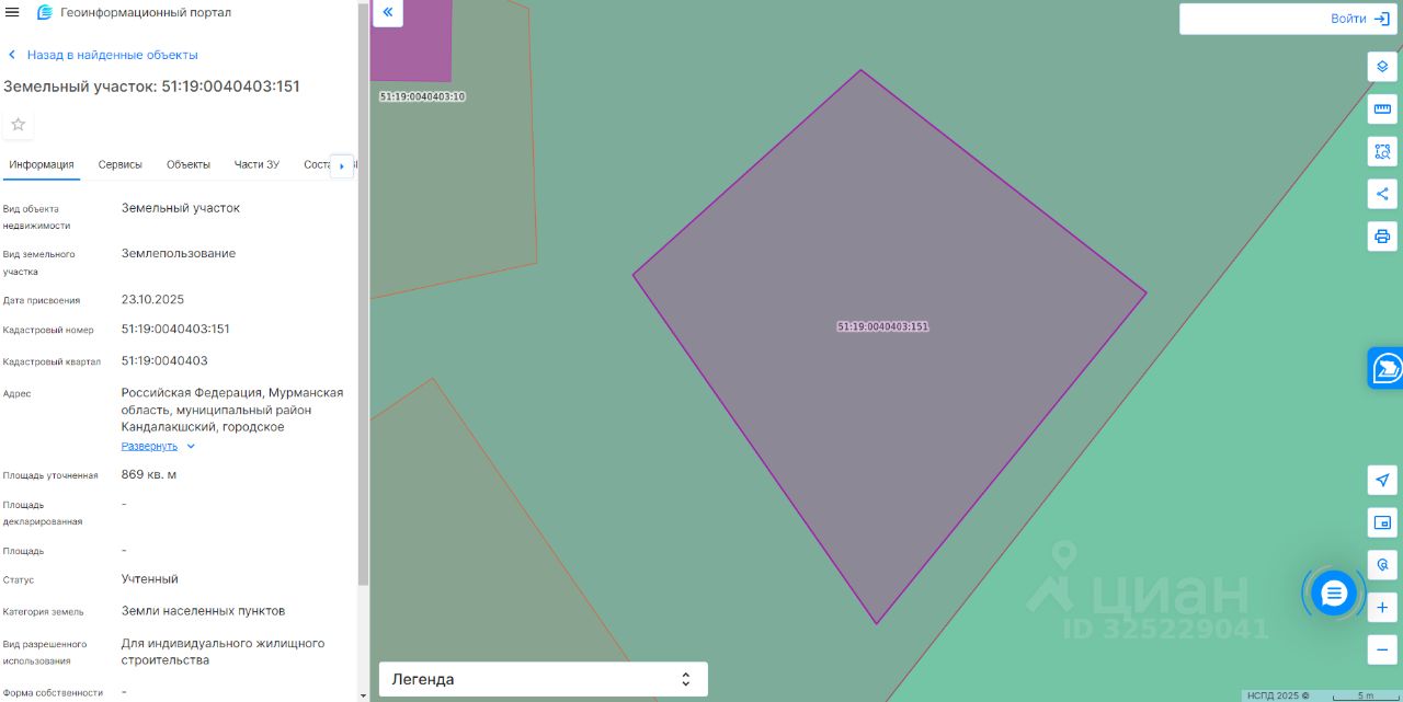 Земельный участок с кадастровым номером 51:19:0040403:151 площадь 869 по адресу Российская Федерация, Мурманская область, муниципальный район Кандалакшский, городское поселение Зеленоборский, село Ковда