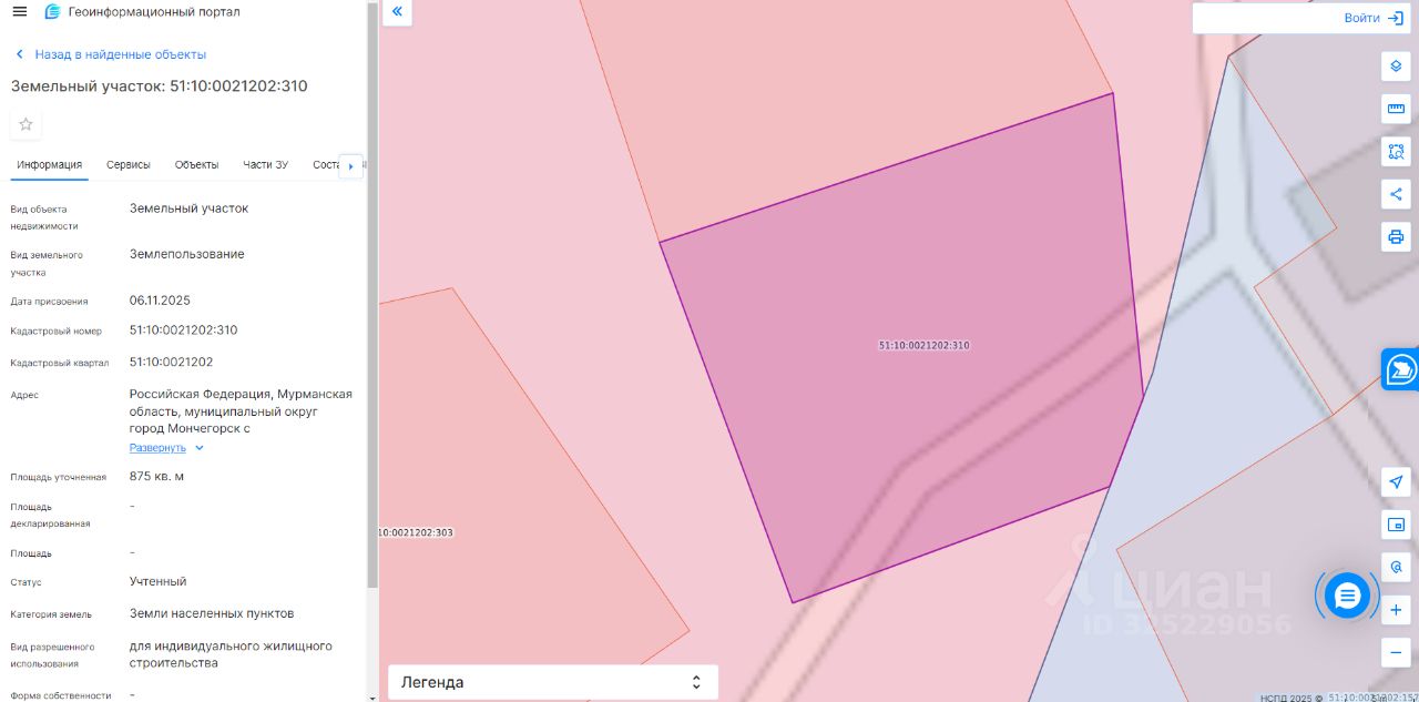 Земельный участок с кадастровым номером 51:10:0021202:310 площадь 875 по адресу Российская Федерация, Мурманская область, муниципальный округ город Мончегорск с подведомственной территорией, город Мончегорск