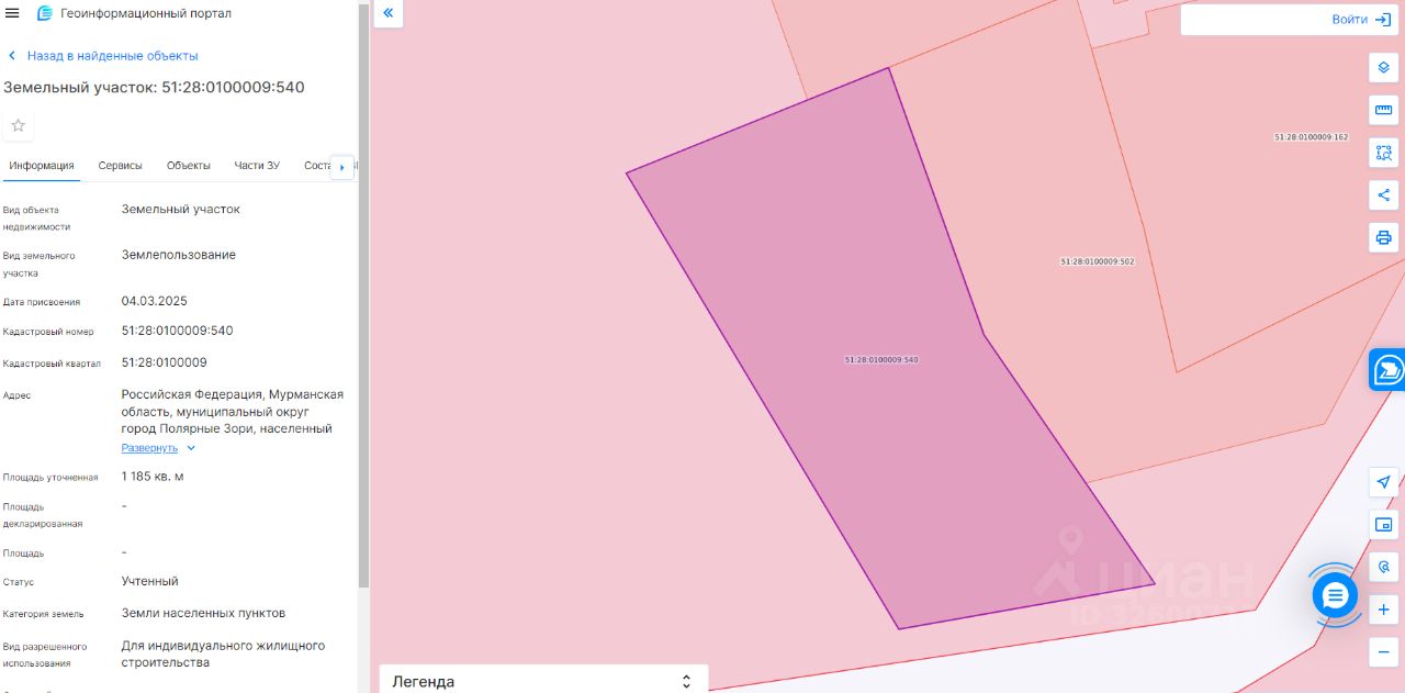 Земельный участок с кадастровым номером 51:28:0100009:540 площадь 1185 по адресу Российская Федерация, Мурманская область, муниципальный округ город Полярные Зори, населенный пункт Зашеек
