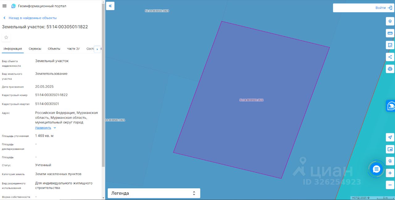 Земельный участок с кадастровым номером 51:14:0030501:1822 площадь 1469 по адресу Российская Федерация, Мурманская область, Мурманская область, муниципальный округ город Апатиты, город Апатиты