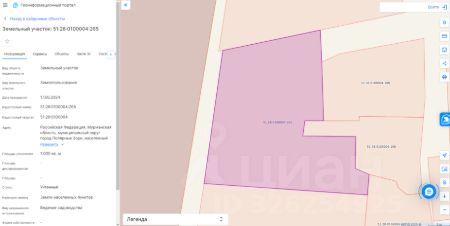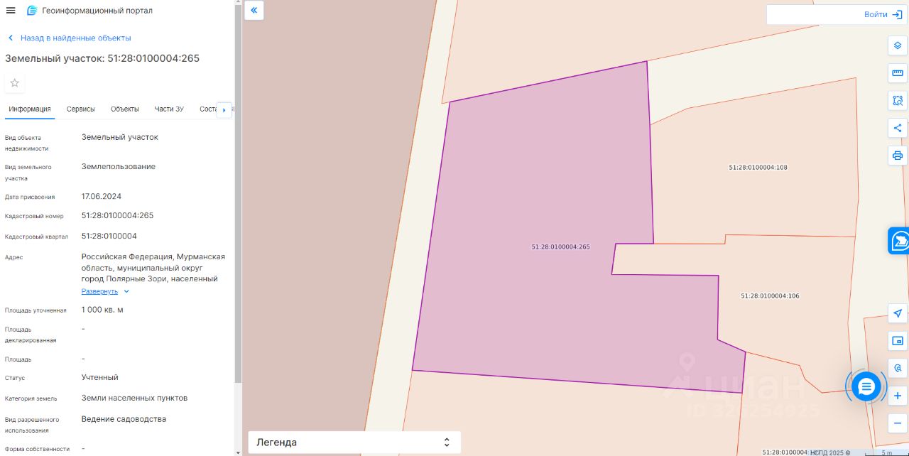 Земельный участок с кадастровым номером 51:28:0100004:265 площадь 1000 по адресу Российская Федерация, Мурманская область, муниципальный округ город Полярные Зори, населенный пункт Зашеек