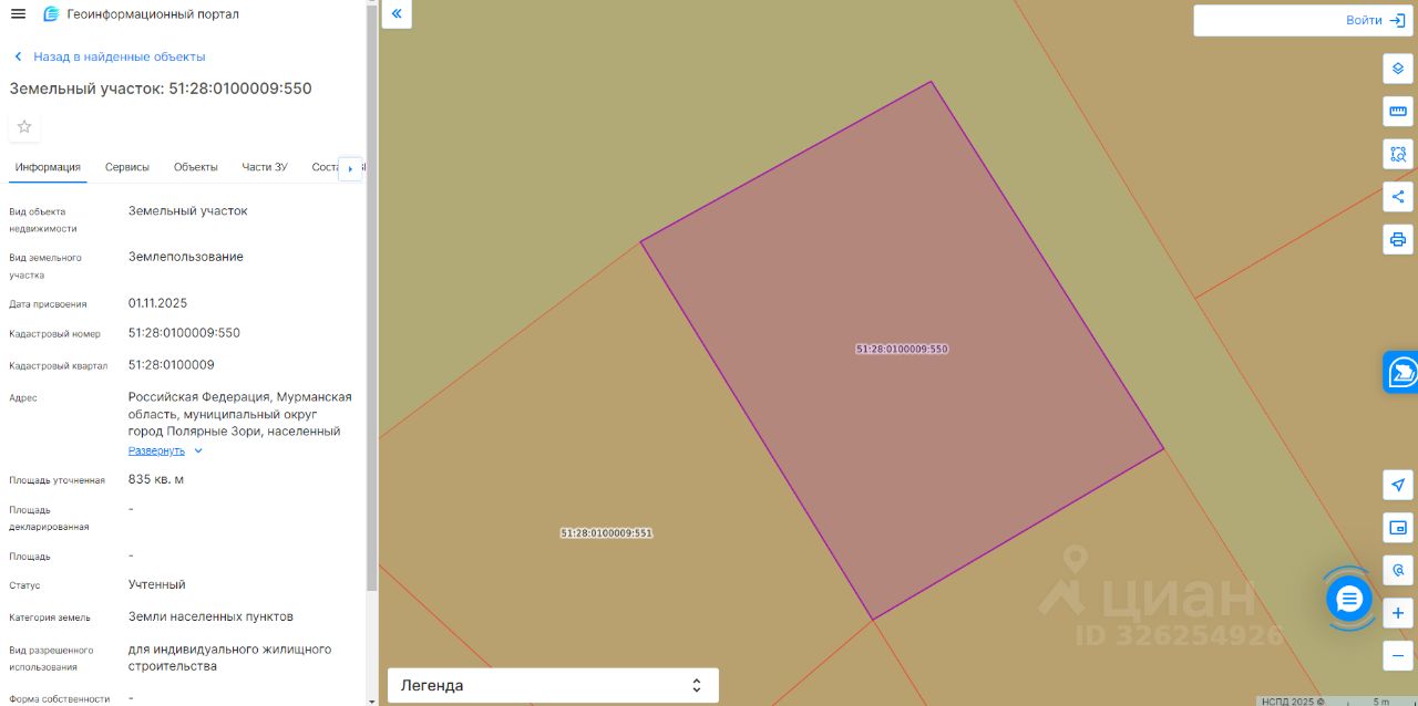 Земельный участок с кадастровым номером 51:28:0100009:550 площадь 835 по адресу Российская Федерация, Мурманская область, муниципальный округ город Полярные Зори, населенный пункт Зашеек
