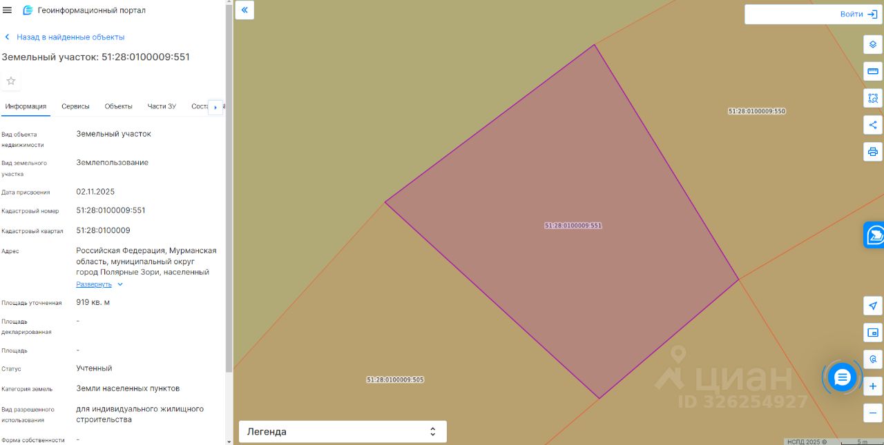 Земельный участок с кадастровым номером 51:28:0100009:551 площадь 919 по адресу Российская Федерация, Мурманская область, муниципальный округ город Полярные Зори, населенный пункт Зашеек