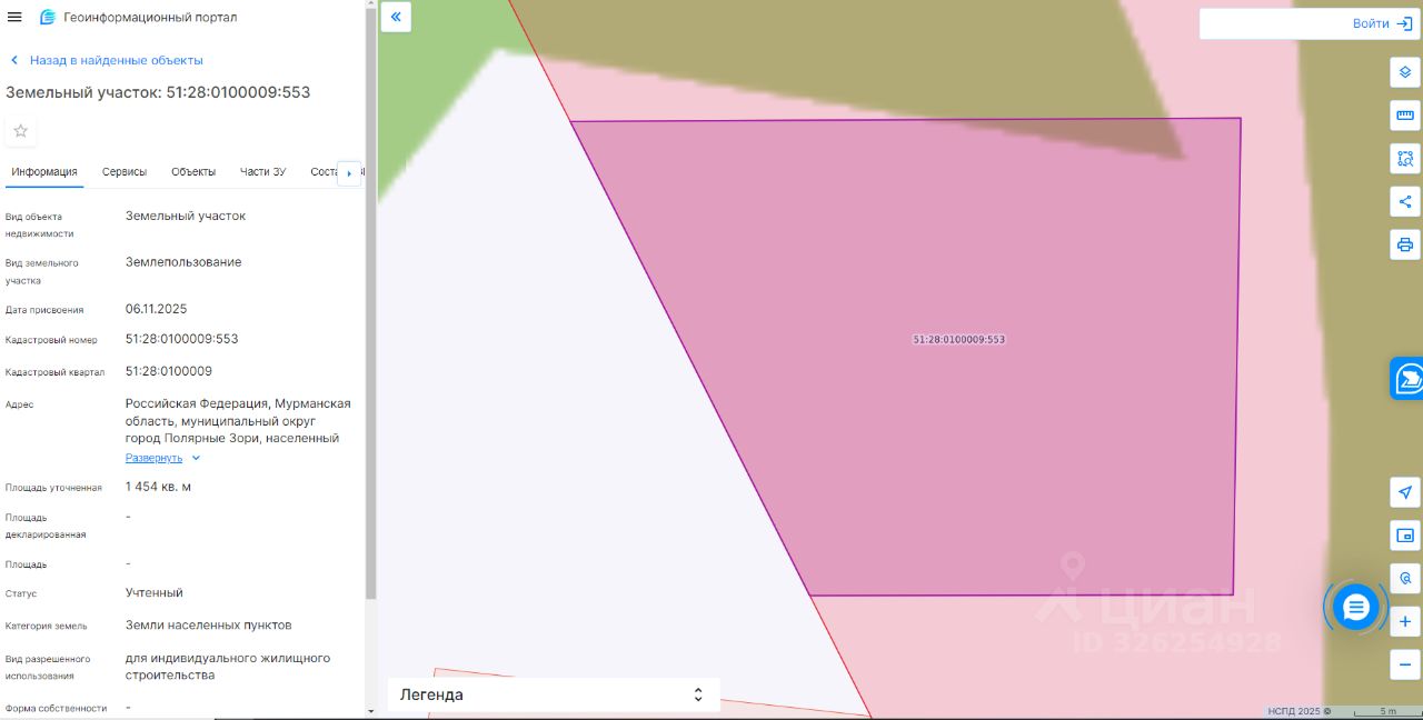 Земельный участок с кадастровым номером 51:28:0100009:553 площадь 1454 по адресу Российская Федерация, Мурманская область, муниципальный округ город Полярные Зори, населенный пункт Зашеек