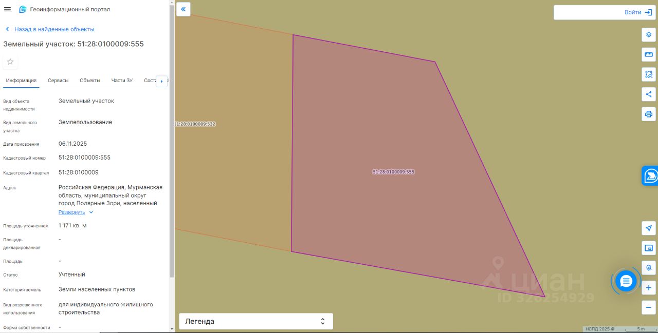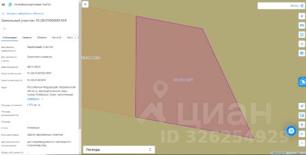Земельный участок с кадастровым номером 51:28:0100009:555 площадь 1171 по адресу Российская Федерация, Мурманская область, муниципальный округ город Полярные Зори, населенный пункт Зашеек