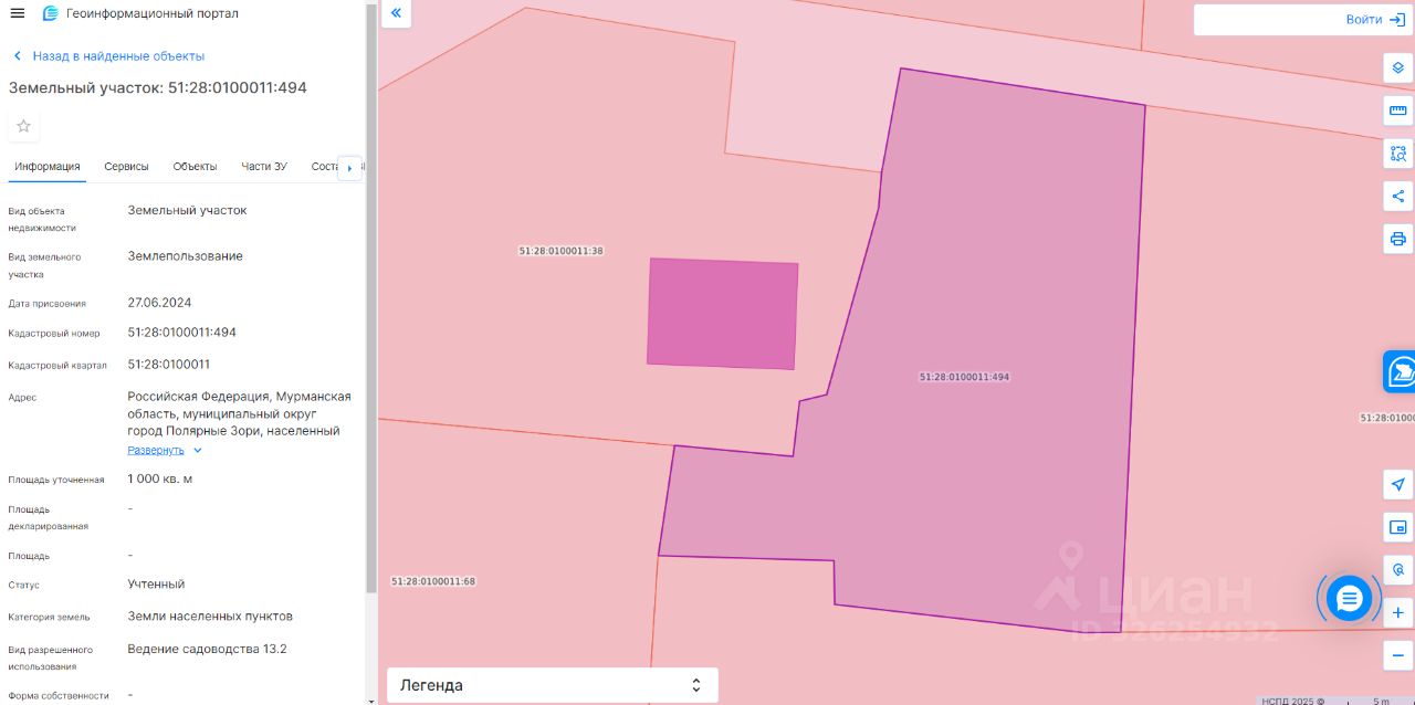 Земельный участок с кадастровым номером 51:28:0100011:494 площадь 1000 по адресу Российская Федерация, Мурманская область, муниципальный округ город Полярные Зори, населенный пункт Зашеек
