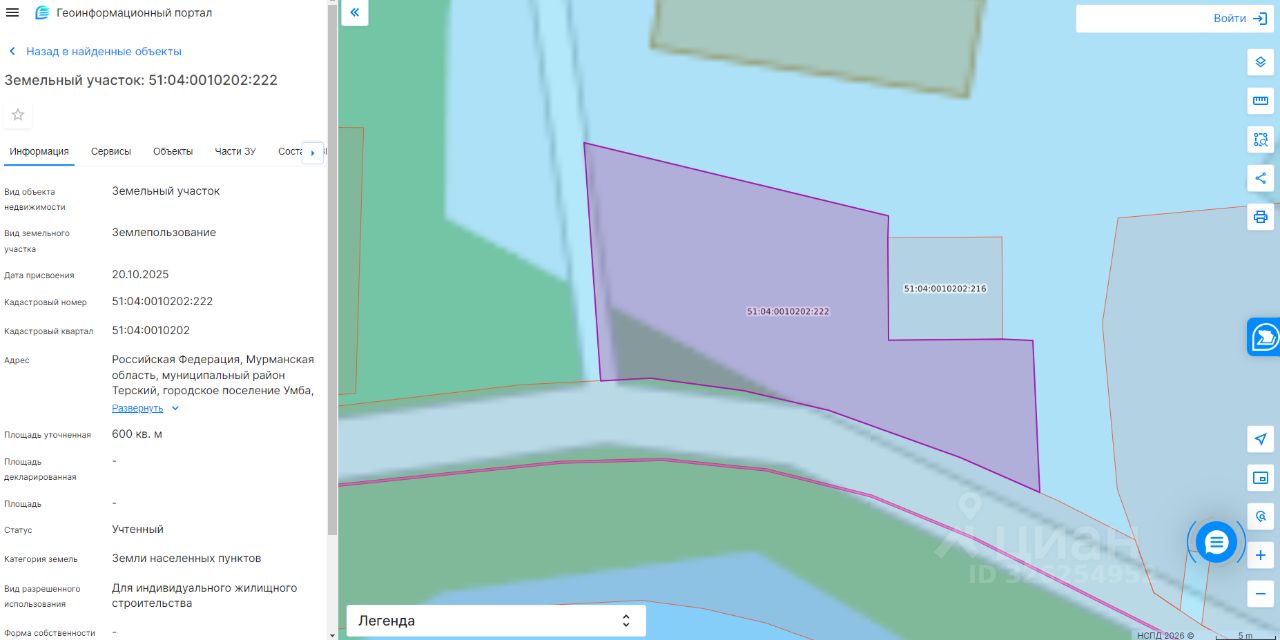 Земельный участок с кадастровым номером 51:04:0010202:222 площадь 600 по адресу Российская Федерация, Мурманская область, муниципальный район Терский, городское поселение Умба, поселок городского типа Умба