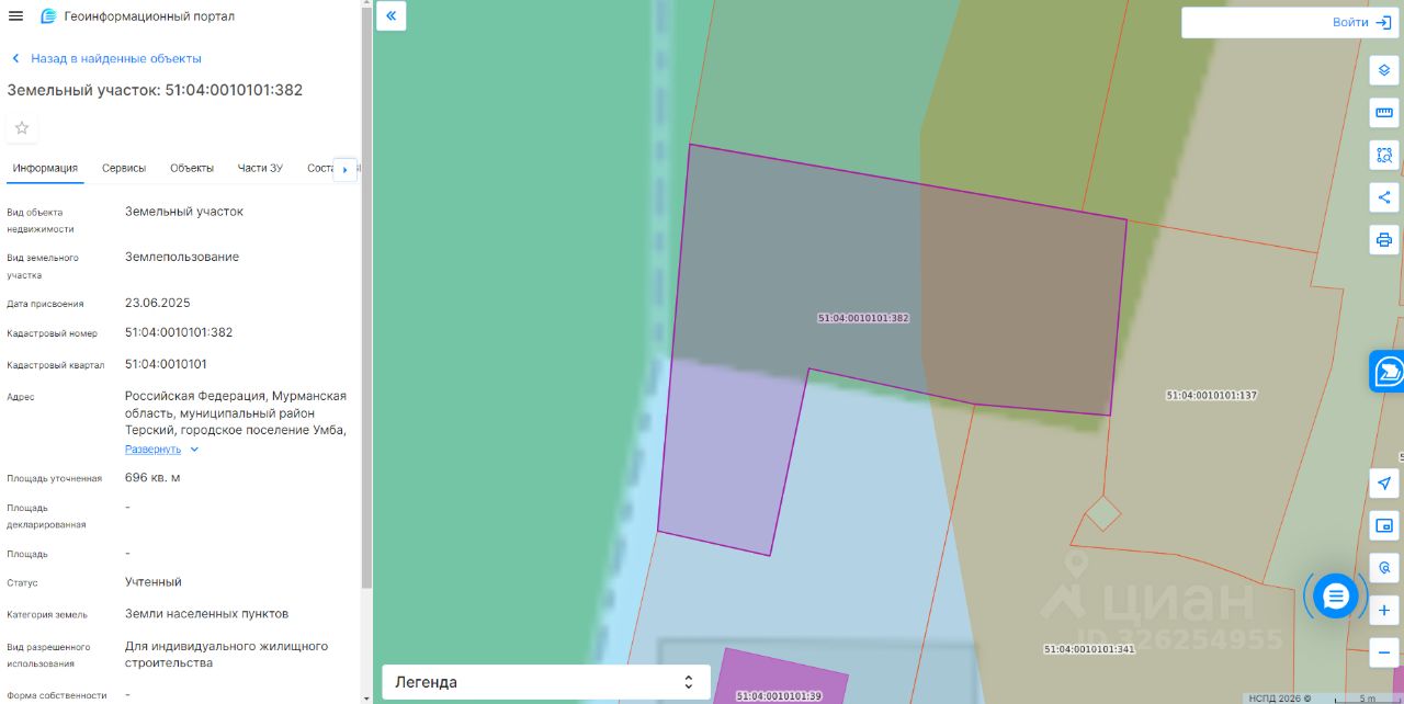 Земельный участок с кадастровым номером 51:04:0010101:382 площадь 696 по адресу Российская Федерация, Мурманская область, муниципальный район Терский, городское поселение Умба, поселок городского типа Умба, улица Морская