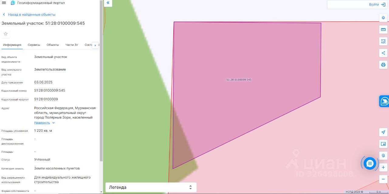 Земельный участок с кадастровым номером 51:28:0100009:545 площадь 1220 по адресу Российская Федерация, Мурманская область, муниципальный округ город Полярные Зори, населенный пункт Зашеек