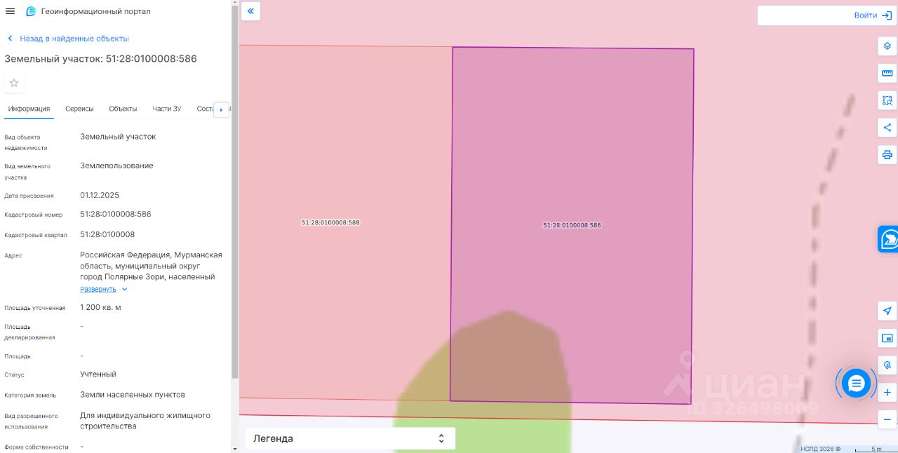 Земельный участок с кадастровым номером 51:28:0100008:586 площадь 1200 по адресу Российская Федерация, Мурманская область, муниципальный округ город Полярные Зори, населенный пункт Зашеек