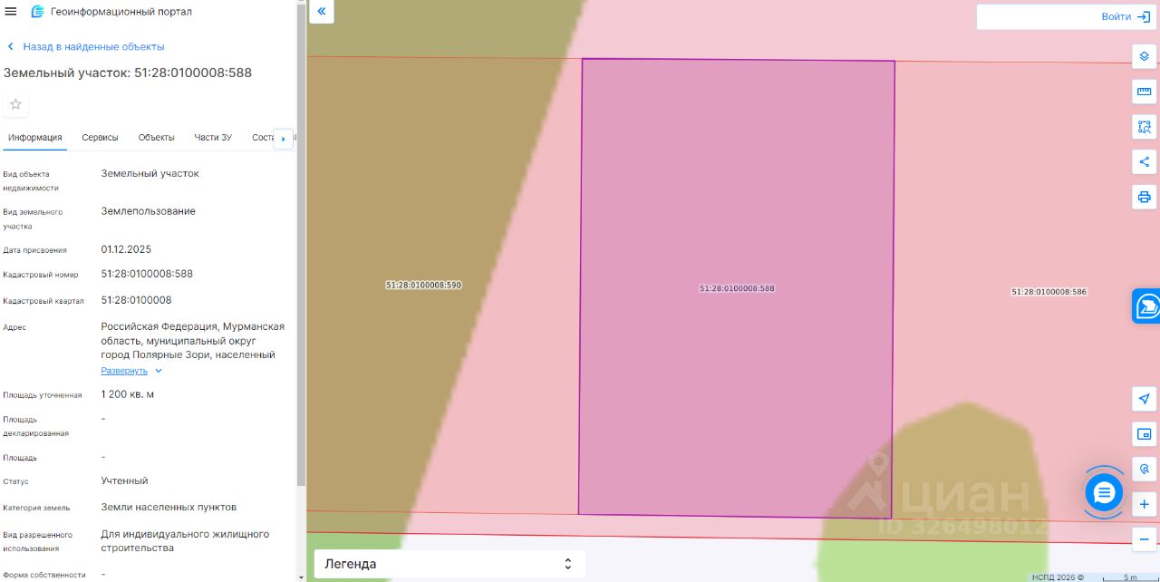 Земельный участок с кадастровым номером 51:28:0100008:588 площадь 1200 по адресу Российская Федерация, Мурманская область, муниципальный округ город Полярные Зори, населенный пункт Зашеек