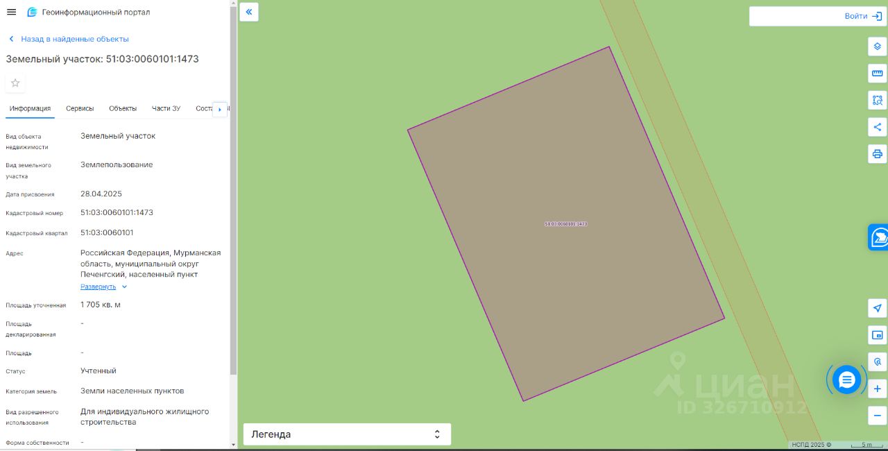Земельный участок с кадастровым номером 51:03:0060101:1473 площадь 1705 по адресу Российская Федерация, Мурманская область, муниципальный округ Печенгский, населенный пункт Приречный