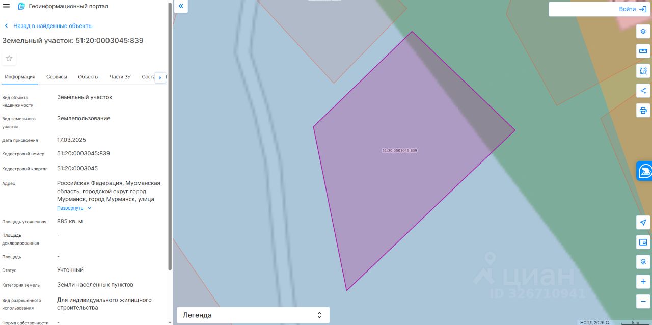 Земельный участок с кадастровым номером 51:20:0003045:839 площадь 885 по адресу Российская Федерация, Мурманская область, городской округ город Мурманск, город Мурманск, улица Большая Ручьевая