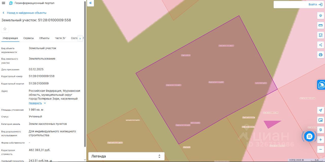 Земельный участок с кадастровым номером 51:28:0100009:558 площадь 1981 по адресу Российская Федерация, Мурманская область, муниципальный округ город Полярные Зори, населенный пункт Зашеек