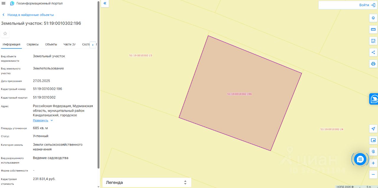 Земельный участок с кадастровым номером 51:19:0010302:196 площадь 685 по адресу Российская Федерация, Мурманская область, муниципальный район Кандалакшский, городское поселение Кандалакша, город Кандалакша