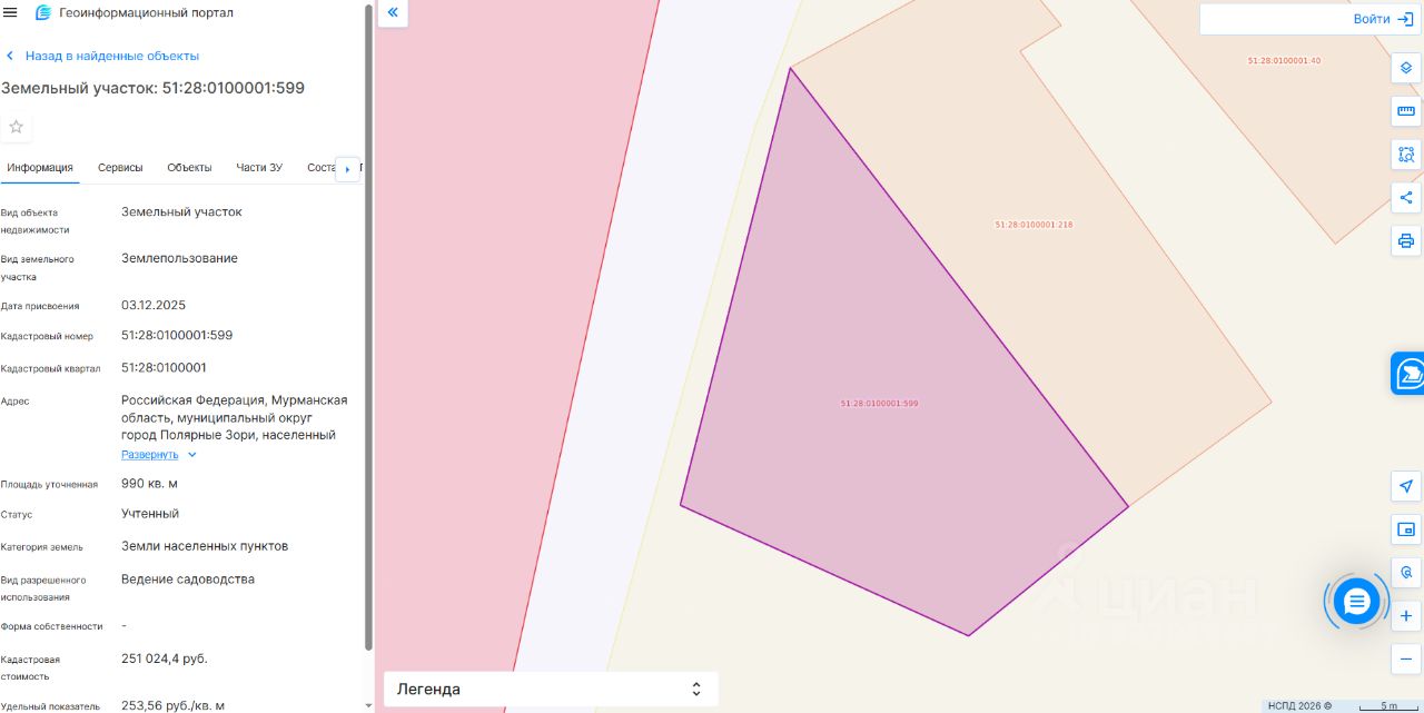 Земельный участок с кадастровым номером 51:28:0100001:599 площадь 990 по адресу Российская Федерация, Мурманская область, муниципальный округ город Полярные Зори, населенный пункт Зашеек