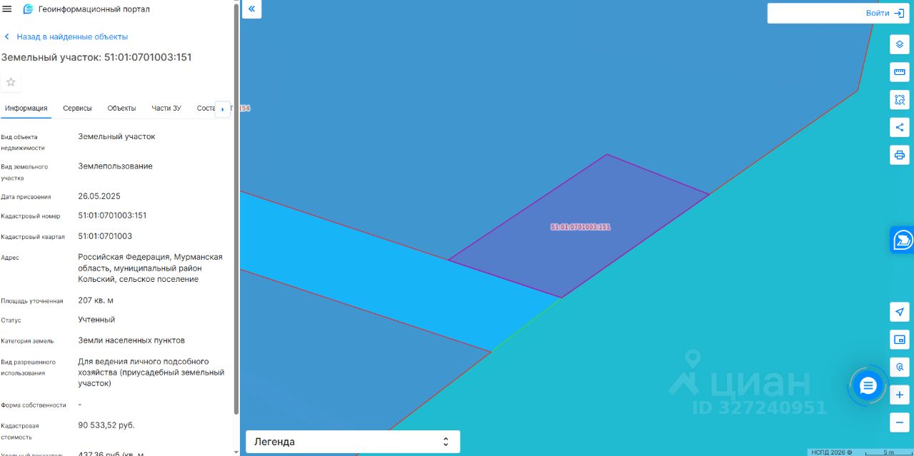Земельный участок с кадастровым номером 51:01:0701003:151 площадь 207 по адресу Российская Федерация, Мурманская область, муниципальный район Кольский, сельское поселение Тулома