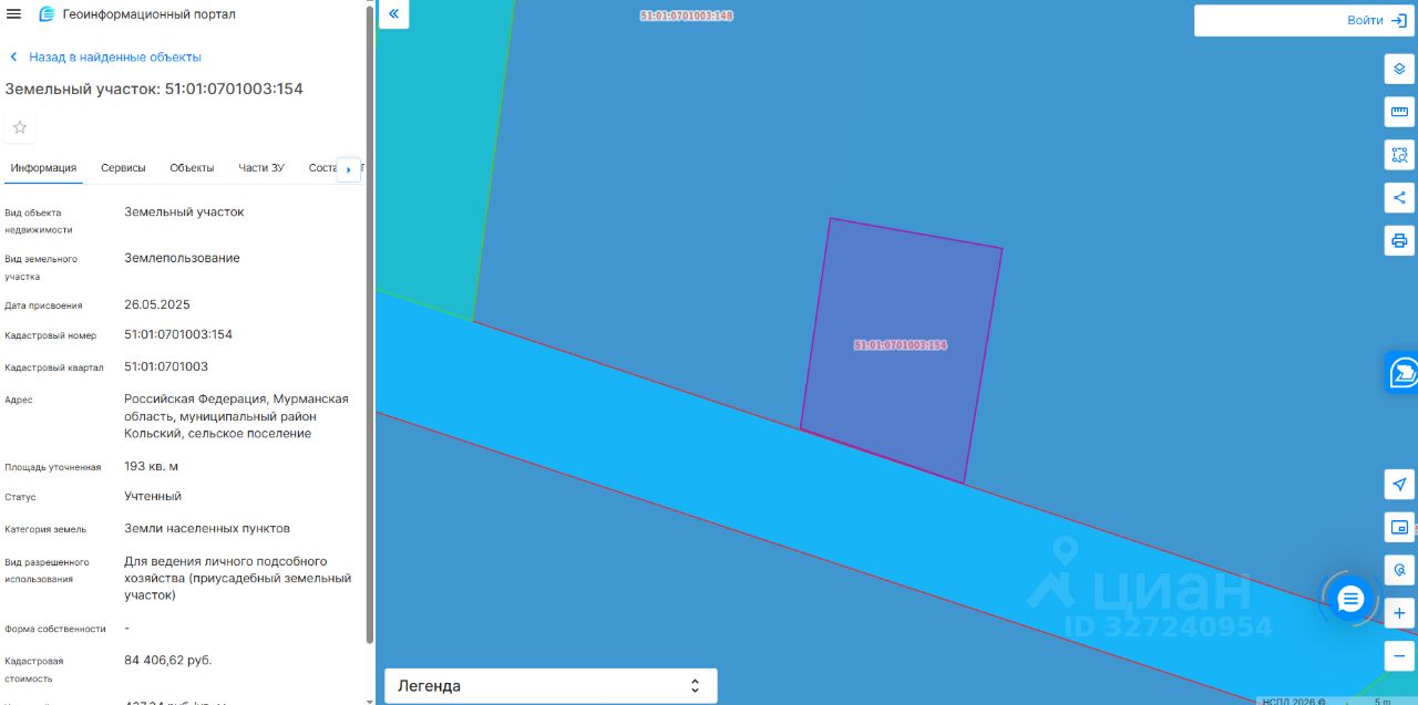 Земельный участок с кадастровым номером 51:01:0701003:154 площадь 193 по адресу Российская Федерация, Мурманская область, муниципальный район Кольский, сельское поселение Тулома
